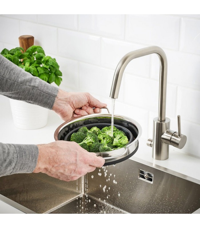 شما می توانید از آبکش ایکیا مدل KLOCKREN/ تاشو به عنوان یک ظرف مخصوص برای بخار پز کردن مواد غذایی خود (نیمه باز) و هنگام پخت ماکارونی( کاملا باز) در اکثر قابلمه های 3 و 5 لیتری استفاده کنید. همچنین این محصول زیبا برای بخارپز کردن سبزیجات، که طعم و مواد مغذی خود را حفظ می کنند بسیار مناسب است. قسمت پایین این محصول از جنس سیلیکون است و تا دمای 220 درجه سانتی گراد را تحمل می کند.