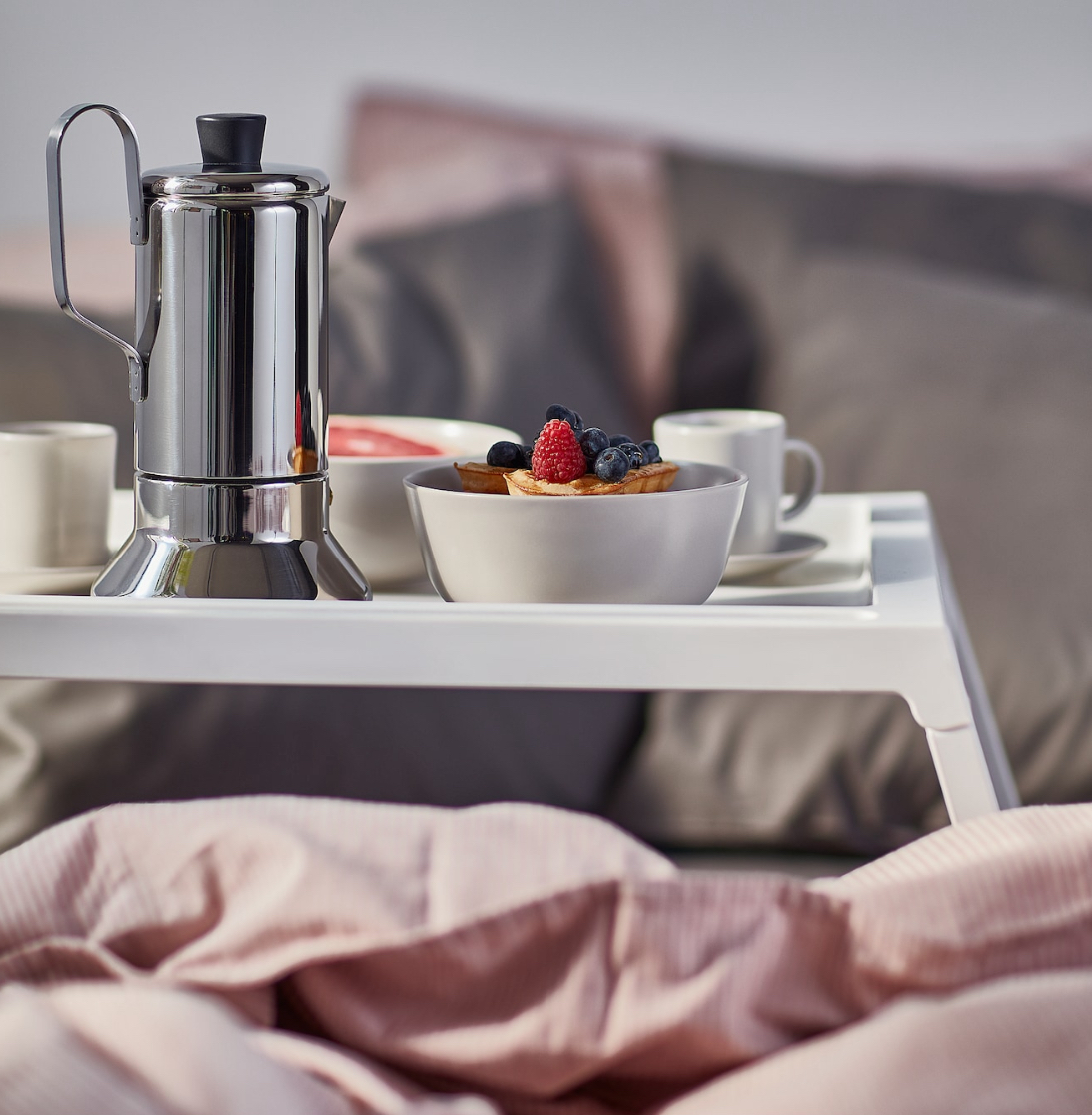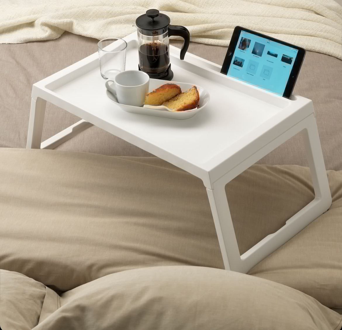 سینی پایه دار سفید ایکیا KLIPSK، مناسب برای کارکردن و هم می توانید از خوردن وعده ی غذایی خود در رختخواب لذت ببرید. در قسمت رویی این سینی یک شیار قرار دارد. که برای گوشی های شما قرار دادهشده است. شما می توانید گوشی خود را در این قسمت قرارداده و همزمان دو کار را انجام دهید. یا اینکه با استفاده از این شیار، همزمان که در حال مطالعه ی کتاب هستید صبحانه ی خود را نیز میل کنید.