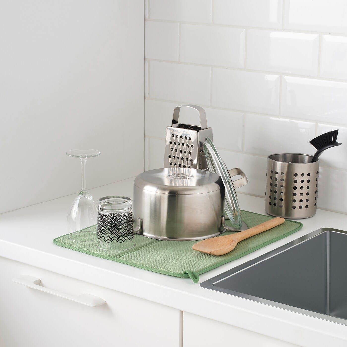 لوازم جانبی هوشمند کار آشپزخانه را آسان کرده و به شما کمک می کند تا میز کار را مرتب و مرتب نگه دارید. از این تشک خشک کن برای به دست آوردن فضای بیشتر برای خشک کردن استفاده کنید یا آن را زیر آبکش ظرف قرار دهید تا تمام قطره ها را جذب کند.
